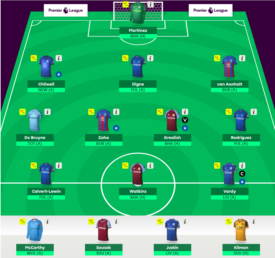 Posle 3 prilicno loša i monotona kola morao sam nešto da menjam. I sezona cela očajna do sada, samo jednom kapitena sam nabo dvocifrenog, pa sad malo drugačiji potez (mada ne nerezonski) i na osećaj Vardija za kapitena. Tri igrača Evertona je isto upitno, ali kad već zaostajem u svim ligama onda može i malo rizičnije. Generalno većina igrača ima jak raspored, mada znajući moju sreću i s obzirom na koronu/povrede surta sigurno saznajem da dvojica ne igraju :D.